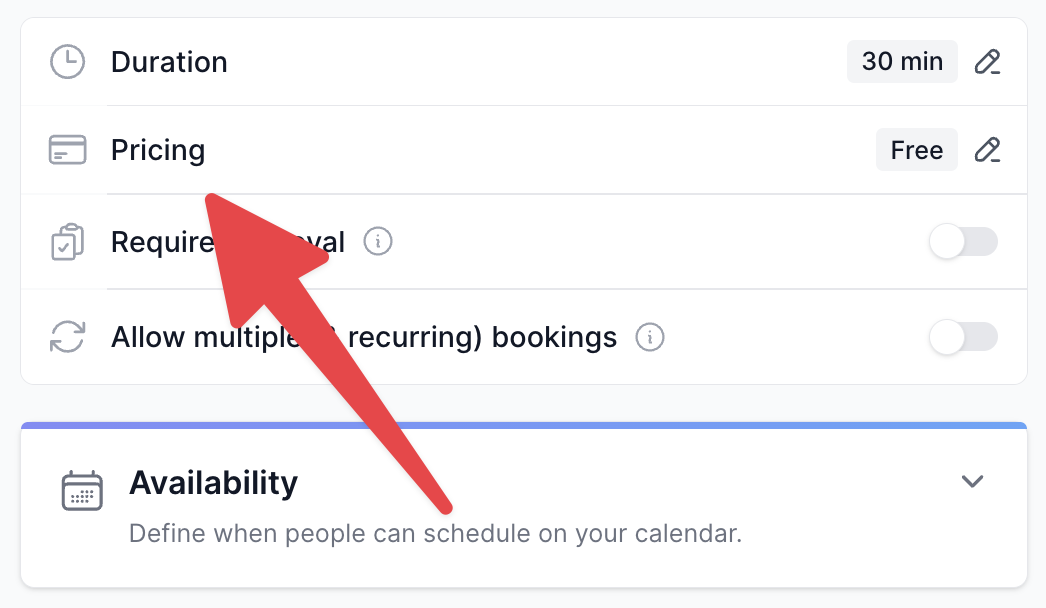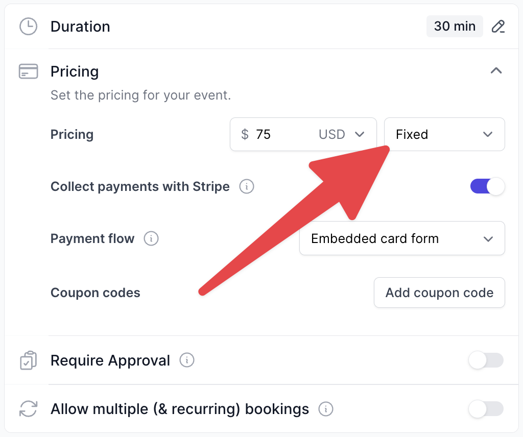 After connecting Stripe, open the Booking Page Editor, scroll to the Pricing section, and: