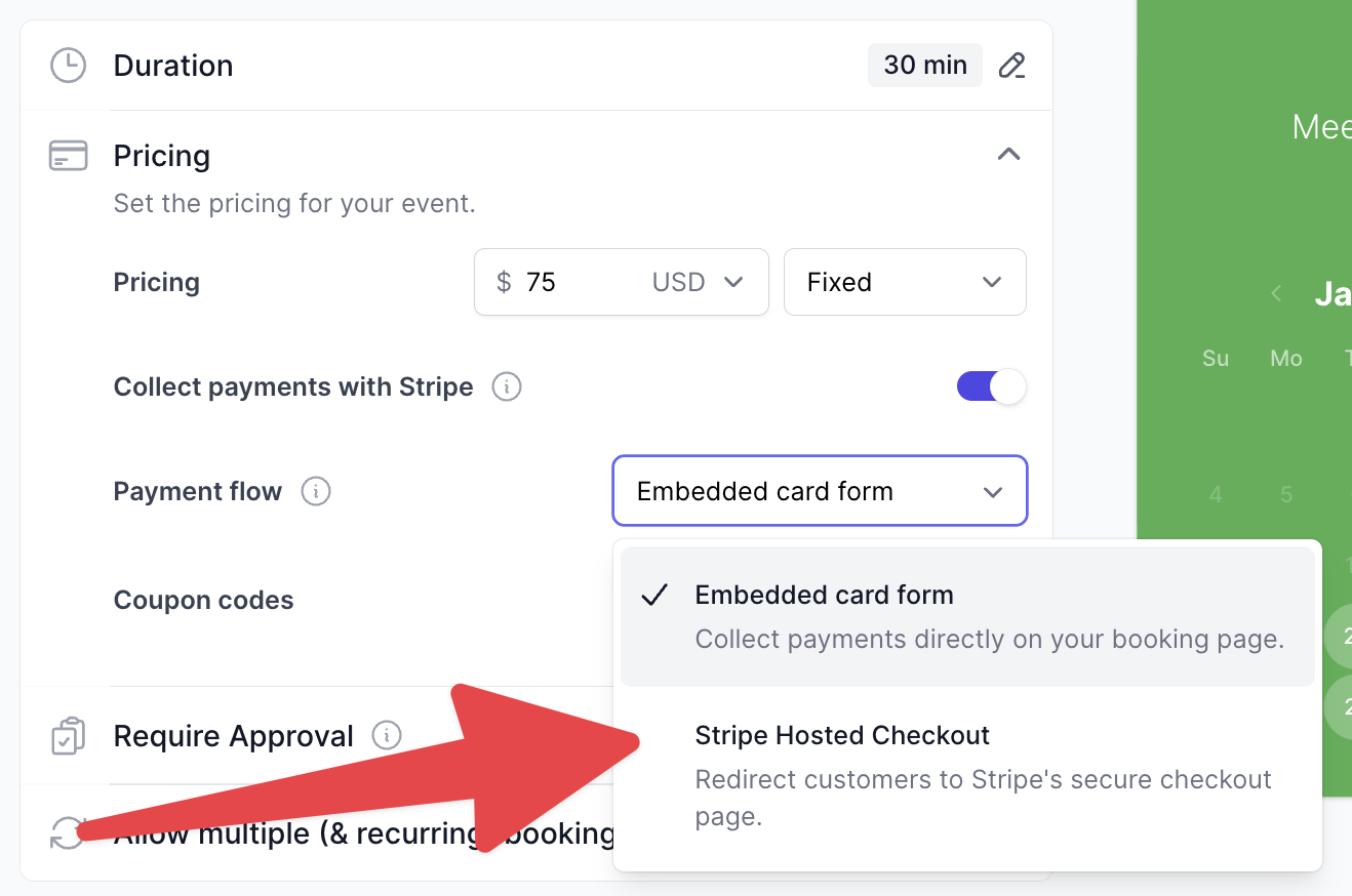 Invitees are redirected to a secure Stripe Checkout page after filling the booking form. This option supports dozens of payment methods available in your Stripe account—such as cards, wallets, and bank transfers—and also lets you enable automatic tax collection.