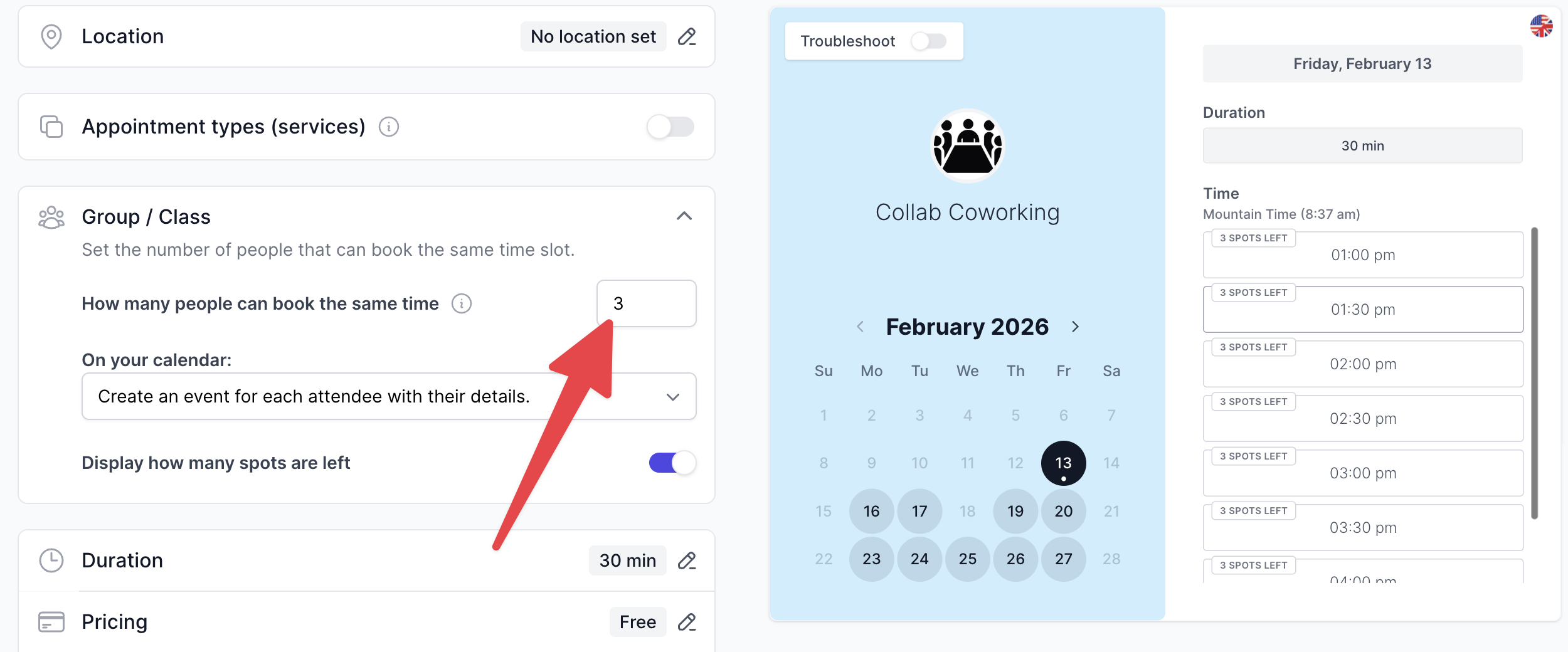 - Set the booking duration options (e.g., 30, 60, or 90 minutes)