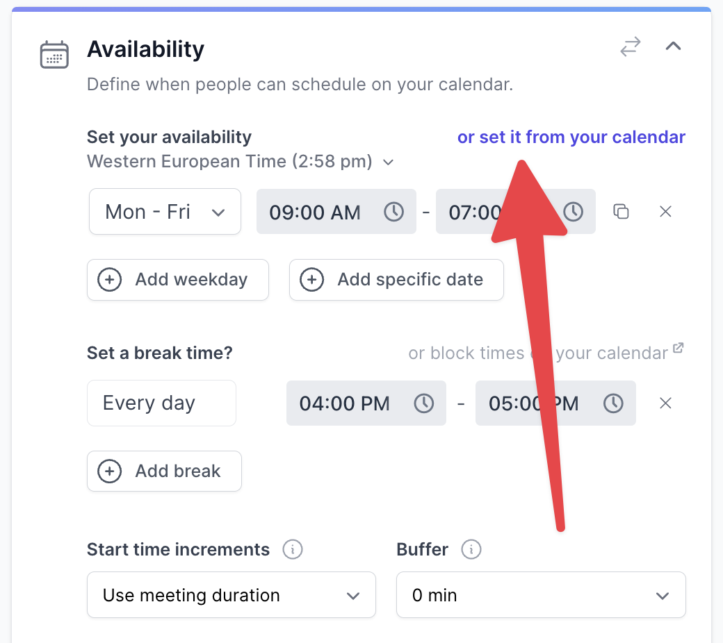 Head to your booking page editor, scroll down to the "Availability" section and click on "or set it from your calendar":