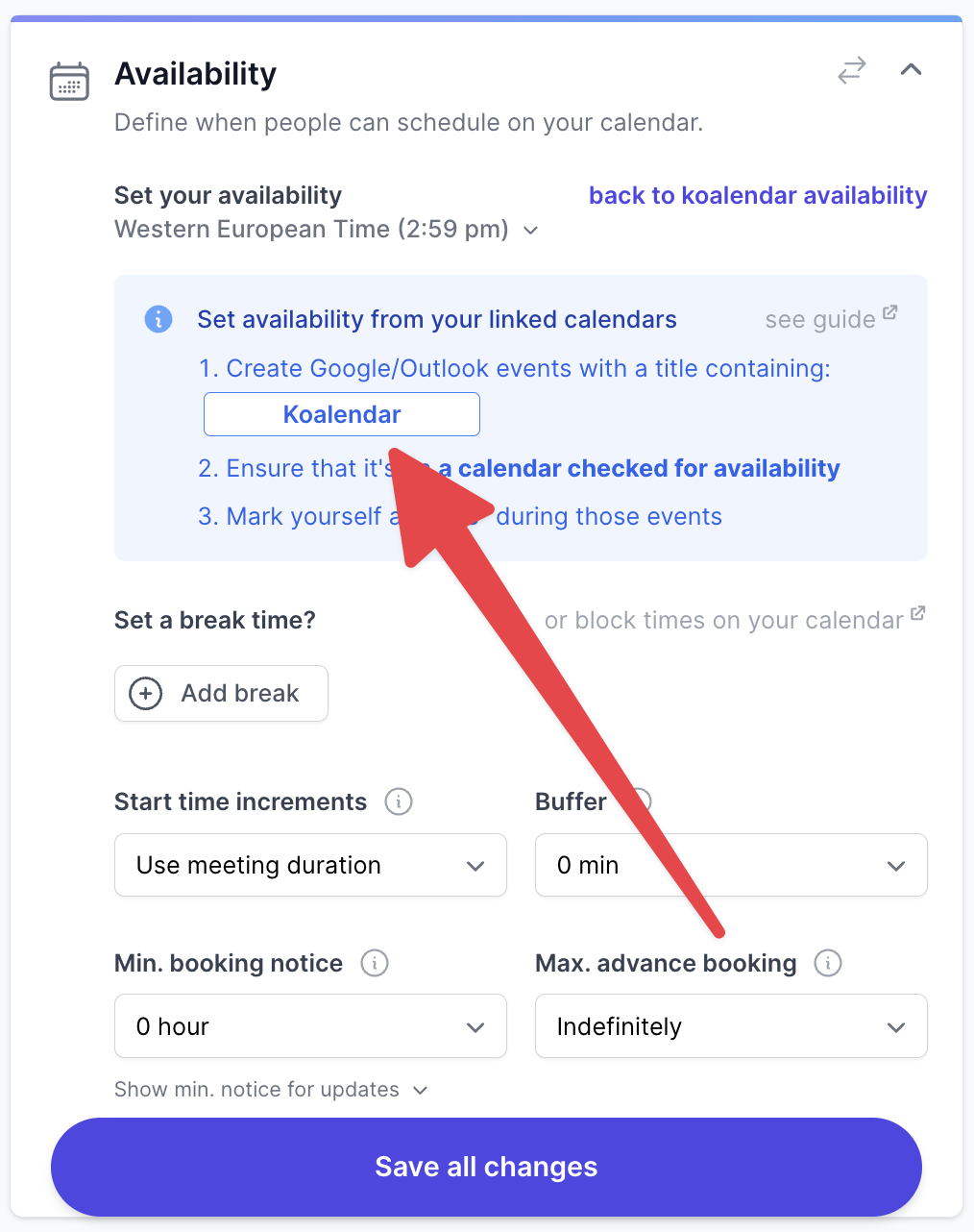 This feature allows you to define when you are available based on whether a specially-named calendar event exists on your calendar - without having to login to Koalendar every time you want to modify availability on a specific day.