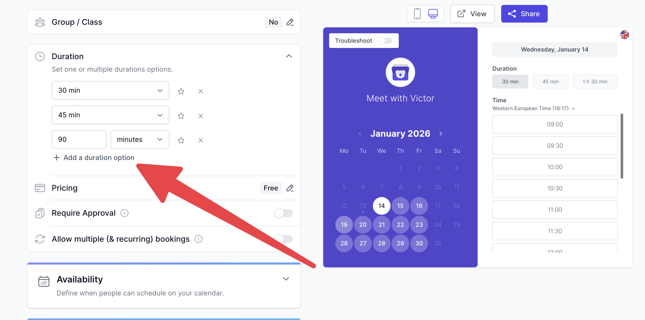 On your public booking page, your recipients will now be able to select their preferred duration: