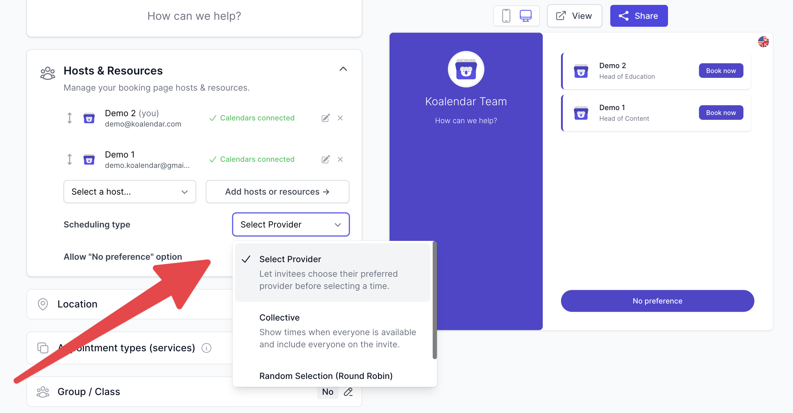 - 👥 Wählen Sie Team-Terminplanungsmodi mit Multi-Host-Seiten, die entweder Buchungen verteilen (zufällige Auswahl (Round Robin)), die Anwesenheit aller erfordern (kollektive Veranstaltungen) oder es dem Eingeladenen ermöglichen, die Person oder Ressource auszuwählen, mit der er sich treffen möchte, bevor er einen Zeitpunkt auswählt (Anbieter auswählen).