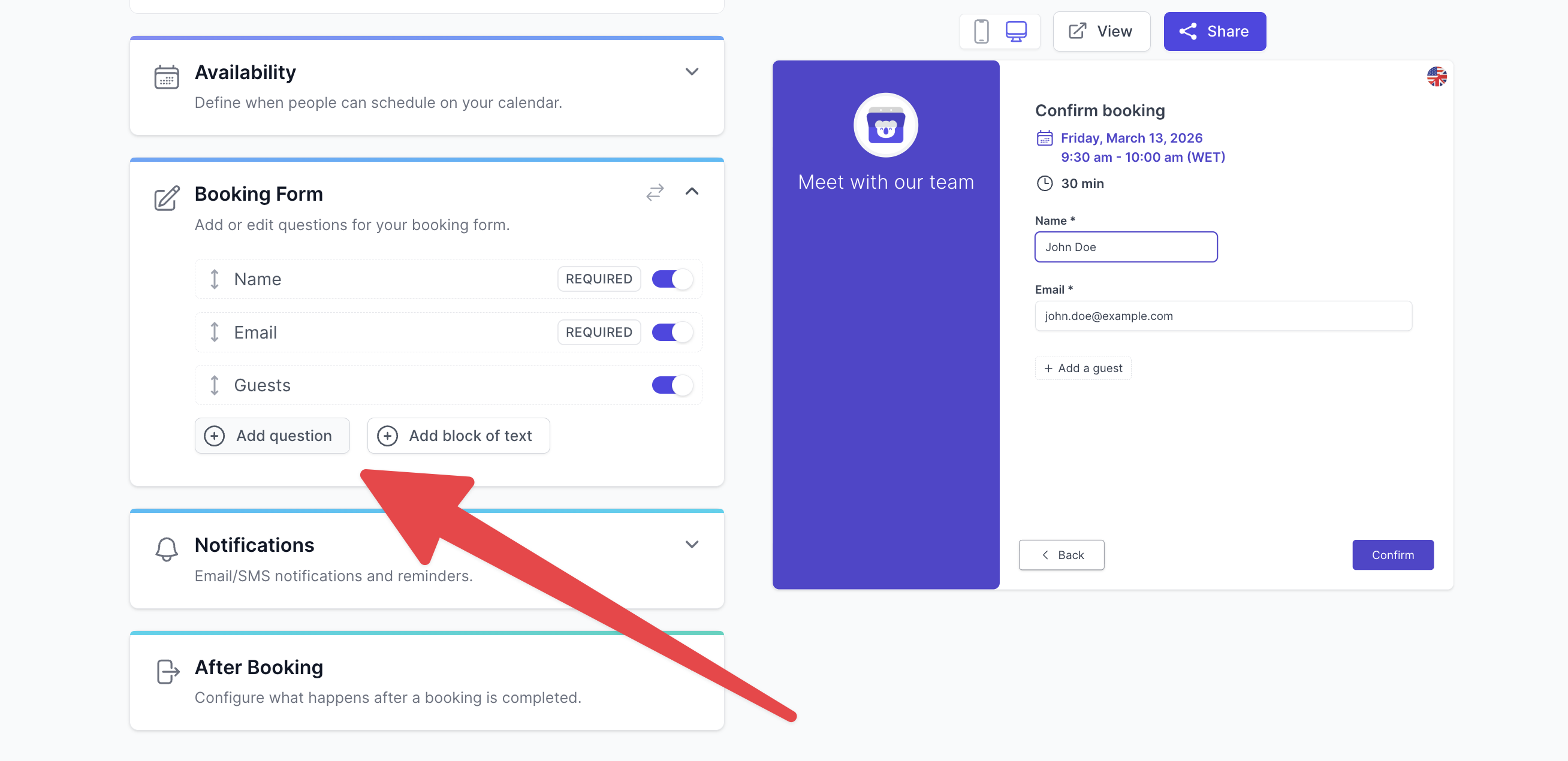 Pour ce faire, ouvrez l'éditeur de votre page de réservation, faites défiler vers le bas jusqu'à la section Formulaire de réservationet cliquez sur Ajouter une question.