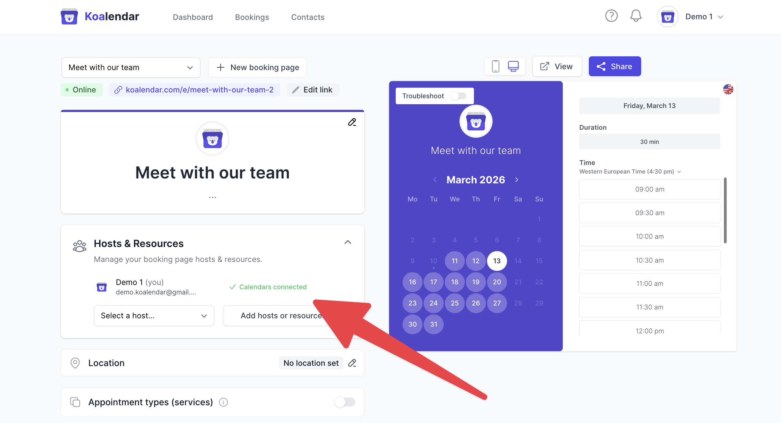 - Dans votre éditeur de réservation, sous Hôtes et ressources, vérifiez avec quels calendriers vous recherchez les conflits (ainsi que tous les sous-calendriers activés ou désactivés).