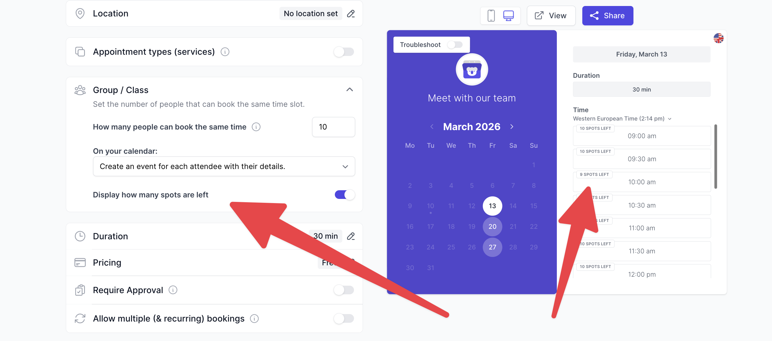 - Activé: les invités verront combien de places sont encore disponibles pour chaque créneau horaire (par exemple, « 3 places restantes »).